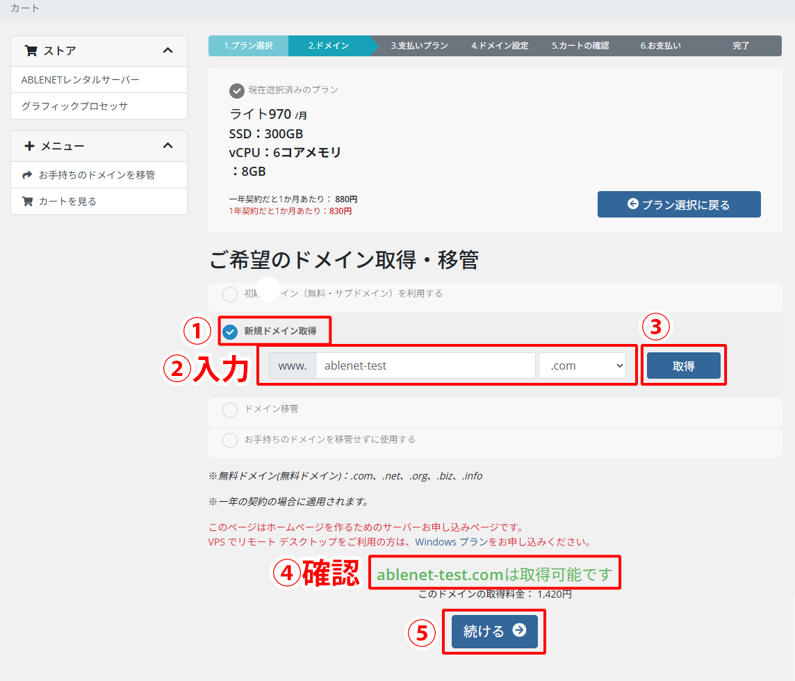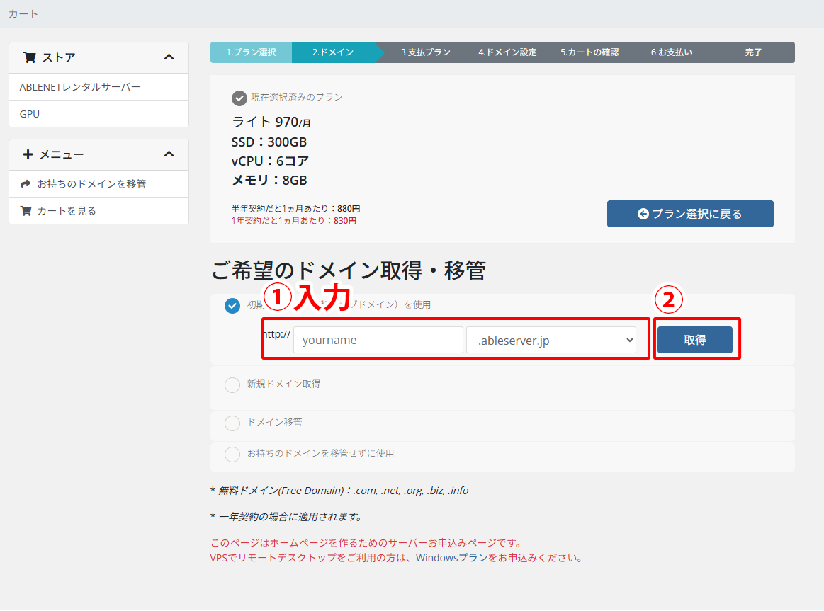 再度ドメイン名を入力し取得を押してください。